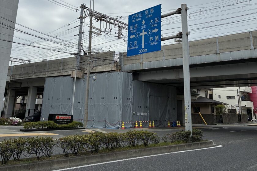 お写真の通り、すぐ上には線路があり、作業スペースには高架橋柱が隣接しています。